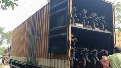 बाइक लदी कंटेनर में 11000 लाइन टच करने से लगी आग